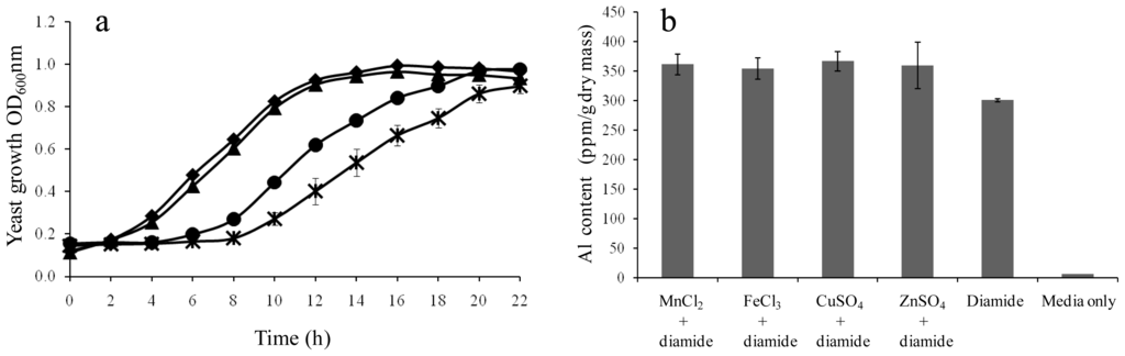 Potassium rescue against LAH and Al3+ accumulation of yeast cells in the presence of other metal ions. (a) Potassium rescue against LAH. Potassium rescue experiment was performed by the time course growth curves including yeast alone (■), yeast plus 5 g/L KCI (▴), yeast plus LAH (×), and yeast plus LAH and 5 g/L KCI (●). Error bars represent standard deviation of two biological replicate measurements; (b) Aluminium accumulation of yeast cells in the presence of other metal ions and diamide. Yeast cultures were treated with individual ion-containing compound as well as 5 mM diamide. These compounds were manganese dioxide, manganese chloride, ferric chloride, copper sulphate and zinc sulphate. A control culture without any element was treated with 5 mM diamide. A media control with neither element nor diamide was also included. Cultures were terminated after 2 h treatment and Al3+ contents were measured using ICP-OES.