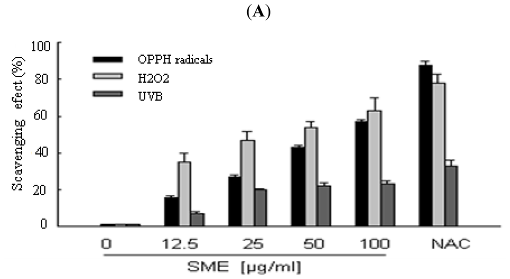 UVB-induced ROS have hazardous effects on the skin, including sunburn, photoaging and skin cancer. UVB rays interact with cellular chromophores and photosensitizers, resulting in the generation of singlet oxygen, superoxide anions, hydroxyl radicals and hydrogen peroxide []. The data presented herein clearly demonstrate that UVB radiation triggered an increase in the intracellular ROS level in HaCaT cells. In this study, SME treatment significantly reduced ROS generation in UVB-irradiated cells, apparently due to the ROS scavenging property of the extract. The data indicate that SME scavenged intracellular ROS, as well as DPPH radicals and hydroxyl radicals. SME also inhibited lipid peroxidation. However, SME did not scavenge superoxide anions generated by the xanthine/xanthine oxidase system, which were detected using ESR (data not shown). Kim et al. reported that SME contained polyphenol (347 mg/g), a well-known antioxidant compound, as assessed the Folin-Denis method []. García-Casal et al. reported that Sargassum species contained a high polyphenol content in comparison with Ulva species and Porphyra species. Sargassum species also showed a higher antioxidant capacity than did the other two species []. Therefore, the high polyphenol content in SME could be partly responsible for its antioxidant effect. On the other hand, brown algae reportedly contain phlorotannins. Phlorotannins are marine algal polyphenols and polymers of phloroglucinol [] that are suggested to exhibit antioxidant effect against ROS [–].