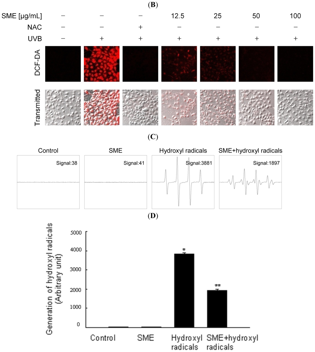 Scavenging effects of SME toward radicals. (A) The level of the DPPH radicals was measured spectrophotometrically at 520 nm. Intracellular ROS levels generated by H2O2 and UVB were detected using a spectrofluorometer after 2′,7′-dichlorodihydrofluorescein diacetate (DCF-DA) staining; (B) Representative confocal images illustrate the increase in the red fluorescence intensity of the ROS-induced DCF in UVB-exposed cells compared with control (non-exposed) cells. Hydroxyl radicals generated by the Fenton reaction (H2O2 + FeSO4) were reacted with 5, 5-dimethyl-1-pyrroline-N-oxide (DMPO), and the resultant DMPO/·OH adducts were detected by ESR spectrometry. Results are shown as representative peak data in (C) and as a histogram in (D); * indicates significantly different from control (p < 0.05) and ** indicates significantly different from the hydroxyl radical group (p < 0.05); (E) Representative confocal images illustrate the increase in the blue fluorescence intensity of the DPPP oxide produced by lipid hydroperoxides in UVB-exposed cells compared with control cells. (A)