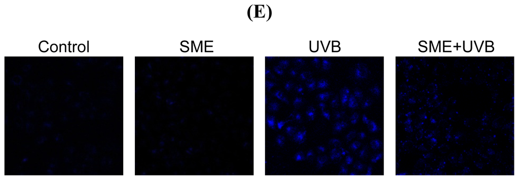 The DCF-DA method was used to detect intracellular ROS levels in HaCaT keratinocytes []. For detection of ROS in H2O2-treated cells, cells were seeded at a density of 1.5 × 105 cells/well. Sixteen hours after plating, cells were treated with SME at concentrations of 12.5, 25, 50 and 100 μg/mL. After 30 min, H2O2 (1 mM) was added to the plate. Cells were incubated for an additional 30 min at 37 °C. For detection of ROS in UVB-exposed cells, cells were treated with SME as described above. After one hour, cells were exposed to UVB radiation at a dose of 150 mJ/cm2. The UVB source was a CL-1000M UV Crosslinker (UVP, Upland, CA, USA), which was used to deliver an energy spectrum of UVB radiation (280–320 nm; peak intensity 302 nm). Cells were incubated for an additional 24 h at 37 °C. After the addition of DCF-DA solution (25 μM) for 10 min, the fluorescence of 2′,7′-dichlorofluorescein was detected using a PerkinElmer LS-5B spectrofluorometer (PerkinElmer, Waltham, MA, USA). Image analysis for the generation of intracellular ROS was achieved by seeding the cells on a cover-slip loaded six-well plate at 2 × 105 cells/well. Sixteen hours after plating, the cells were treated with SME at a concentration of 100 μg/mL. One hour following SME treatment, the plate was irradiated with UVB. Twenty four hours later, DCF-DA (100 μM) was added to each well, and cells were incubated for an additional 30 min at 37 °C. After washing with phosphate-buffered saline (PBS), the stained cells were mounted onto a microscope slide in mounting medium (DAKO, Carpinteria, CA, USA). Images of the cells were collected using the laser scanning microscope 5 PASCAL program (Carl Zeiss, Jena, Germany) on a confocal microscope.