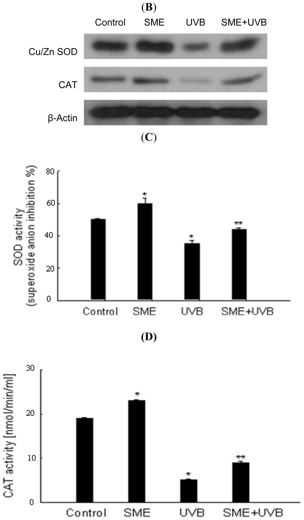 The effects of SME on the protein expression level and activity of antioxidant enzymes. (A and B) Cell lysates were electrophoresed in SDS-PAGE gels and transferred to nitrocellulose membrane. Cu/Zn SOD and CAT were detected on immunoblots via reaction with their specific antibodies; (C) SOD activity was measured using a colorimetric assay kit, and activity was represented as the percent inhibition of the superoxide anions. * indicates significantly different from control (p < 0.05), and ** indicates significantly different from UVB-exposed cells (p < 0.05); (D) CAT activity was measured using a colorimetric assay kit, and activity was represented as nmol/min/mL. * indicates significantly different from control (p < 0.05), and ** indicates significantly different from UVB-exposed cells (p < 0.05).