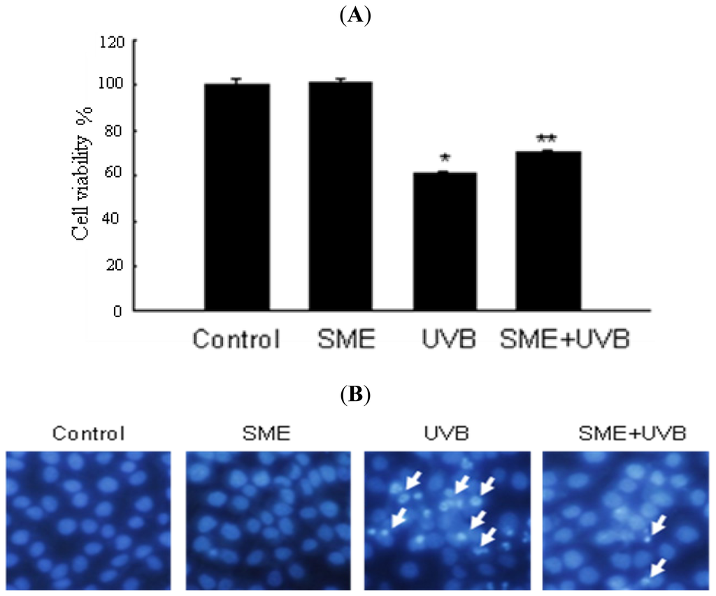 Cells were treated with SME at a concentration of 100 μg/mL and exposed to UVB one hour later. Cells were incubated for an additional 48 h at 37 °C. The DNA-specific fluorescent dye Hoechst 33342 (1.5 μL of a 10 mg/mL stock solution) was added to each well, and the cells were incubated for 10 min at 37 °C. The stained cells were then visualized under a fluorescence microscope equipped with a CoolSNAP-Pro color digital camera to examine the degree of nuclear condensation, and the apoptotic cells were quantified.