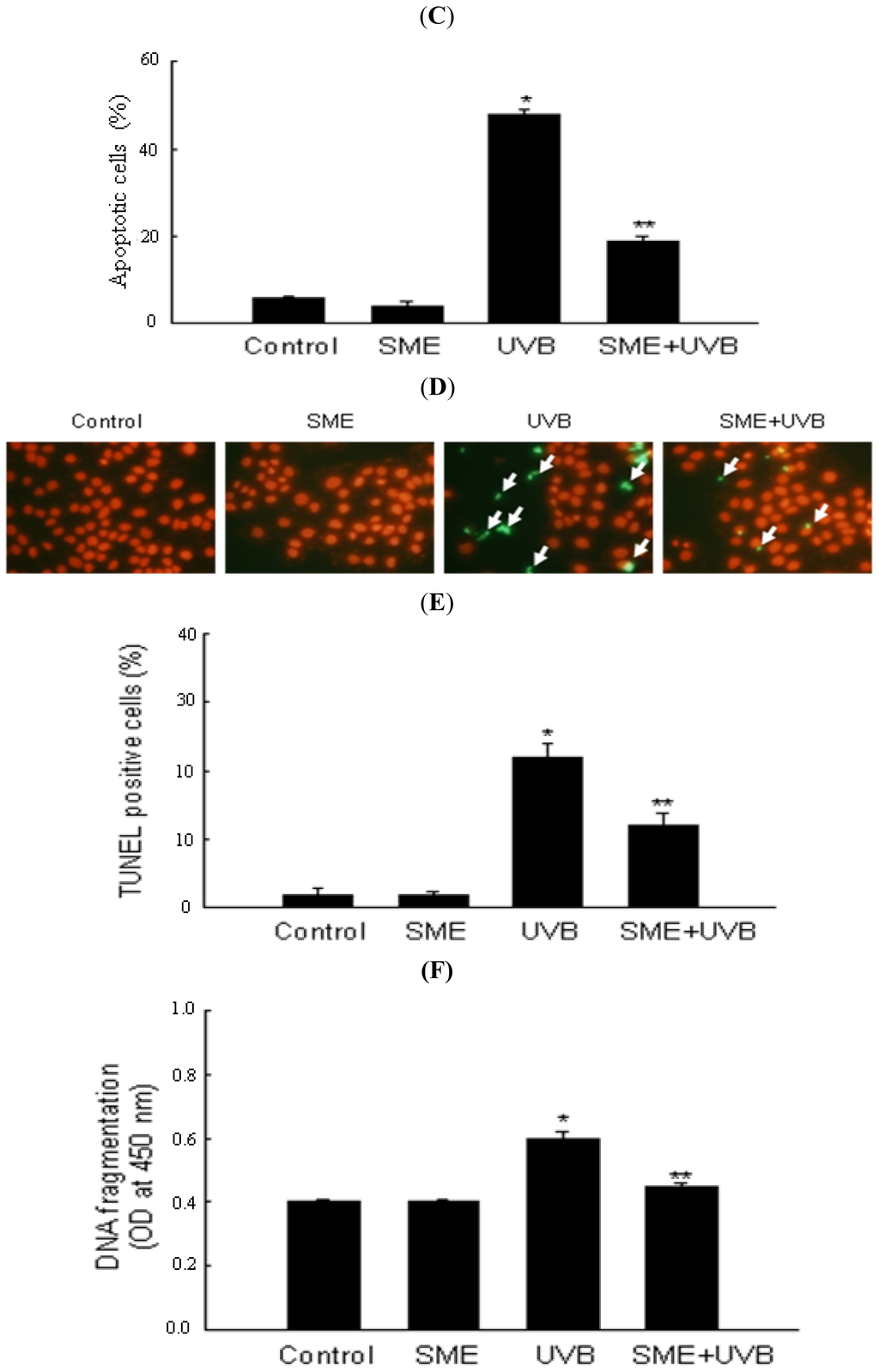 The effect of SME on UVB-induced cell death. Cells were treated with SME at a concentration of 100 μg/mL, exposed to UVB radiation 1 h later and incubated for 48 h. (A) Cell viability was determined by the MTT assay. * indicates significantly different from control (p < 0.05), and ** indicates significantly different from UVB-exposed cells (p < 0.05); (B) Apoptotic bodies (arrows) were observed under a fluorescence microscope in cells stained with Hoechst 33342 and (C) quantified. * indicates significantly different from control (p < 0.05), and ** indicates significantly different from UVB-exposed cells (p < 0.05); (D) Apoptotic cells were detected by the TUNEL staining assay and (E) quantified. The arrows point to TUNEL-positive cells; (F) DNA fragmentation was quantified using a cytoplasmic histone-associated DNA fragmentation kit. * indicates significantly different from control (p < 0.05), and ** indicates significantly different from UVB-exposed cells (p < 0.05).