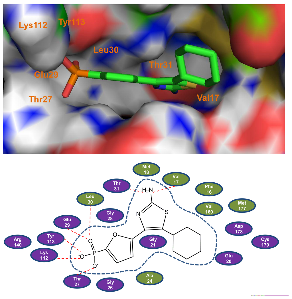 As can be seen from the figure, the phosphate of compound 27 forms hydrogen bond interactions with the main chain NH group residues of Thr27, Glu29, Leu30, with the OH of Tyr113, Thr27, and the side chain NH3+ group residue of Lys112. In addition, the amino group attached to the thiazole ring forms two other hydrogen bonds with the FBPase residues: one with the carbonyl O of Val17 and the other with the side chain OH of Thr31. Besides these hydrogen bond interactions, the van der Waals interactions also play a central role in the ligand binding as shown in Figure 1. The furan ring interacts with the main chain carbons of Gly26 and Gly28, with the side chain carbons of Leu30 and Val160. Interactions between the thiazole core and the binding pocket, besides hydrogen bond interactions, are mainly van der Waals contacts with the Phe16, Val17 and Met18. For the cyclohexyl ring, one can notice that the cyclohexyl ring produces van der Waals interactions with the amino residues of Ala24, Glu20, Asp178, Cys179 and Met177. All these interactions fix the inhibitor 27 in the binding pocket steadily.