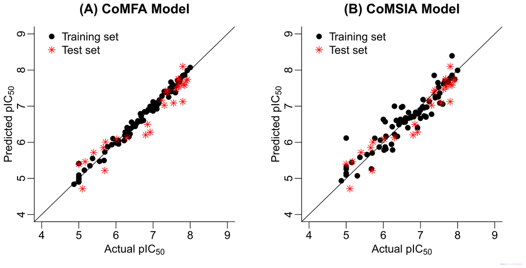 For the receptor-based 3D-QSAR studies, it can be observed that no statistically acceptable results were obtained in terms of both internal and external validation criteria (Table 1). Thus, we focus on our further research to the optimal ligand-based CoMFA and CoMSIA models. Figure 2 illustrates the correlation plots of the experimental versus the predicted pIC50 values of the training (black dot) and test (red asterisk) sets for the two 3D-QSAR models. Clearly, good correlationships are observed since the predicted values are almost as accurate as the experimental activities for the whole dataset (especially for the CoMFA model). Table S1 (Supporting Information) lists the predicted results of the whole data set.