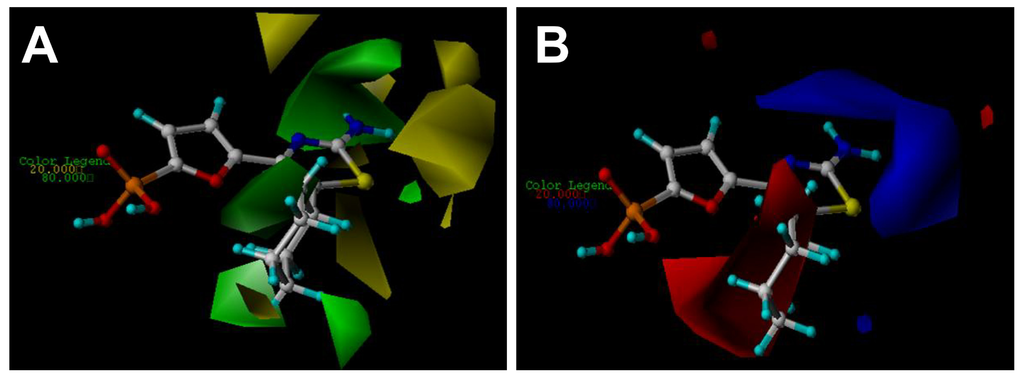 The steric and electrostatic fields from the best CoMFA model are represented in Figure 3. In the steric field (Figure 3A), the green-colored contours represent the regions of favorable steric effect, while yellow-colored contours represent regions of unfavorable steric effect, respectively.