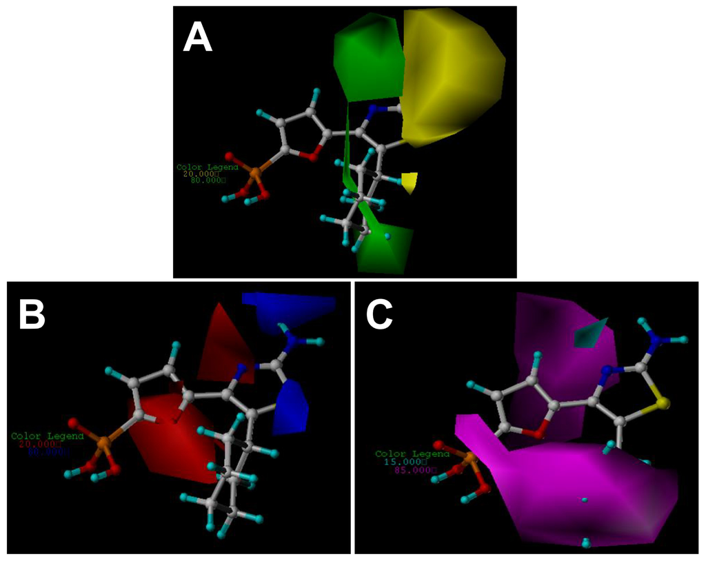 The CoMFA electrostatic contour map with the most potent compound 27 is shown in Figure 3B. Blue contour maps mean that positive-charged substituent groups are beneficial for the activity while red contours indicate that negative charges are conducive. As shown in Figure 3B, blue contour maps are observed surrounding the amino group at the C2 position of the thiazole core suggesting that a charge withdrawing group near these positions enhances the biological activity. The investigation is in agreement with previous docking results. As can be seen in Figure 1, the –NH2 group, as a hydrogen bond donor, can interaction with both Thr31 and Val17. In addition, one can also notice that substituent of the hydrogen atom with methyl group (compound 11) leads to a large loss of potency compared to compound 10 probably due to the lack of the hydrogen bond donor atom. In addition, a large red contour map exists around the phosphate group and embeds the cyclohexyl group illustrating that in these positions electro-rich groups are beneficial for increasing the activity. This may be a reason that all compounds of the dataset contain such electronegative groups (phosphate group).