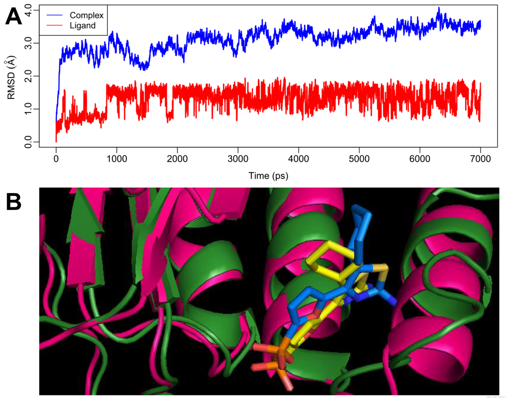 (A) Plot of the root-mean-square deviation (RMSD) of docked complex/ligand versus the MD simulation time in the MD-simulated structures. (B) View of superimposed backbone atoms of the average structure of the last 1000 ps of the MD simulation (forest green) and the initial structure (hot pink) for inhibitor 27-FBPase complex. Compound 27 is represented in yellow for the initial structure and blue for the final average complex.