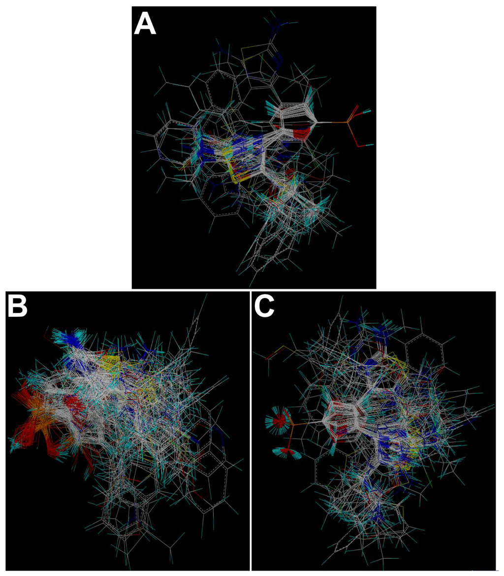 Molecular alignment of compounds is a crucial step for the successful development of 3D-QSAR models [40]. Thus, in the present work, three alignment methods were performed. Alignment I: In this process, the most potent compound 27 was chosen as a template to fit the remaining training and test set of compounds. Thereafter, all compounds finally minimized with the lowest energy in the dataset were aligned to a common substructure (using the phosphate radical) by substructure-based alignment method using the “align database” command in SYBYL (Figure 6A). Alignment II: It is the alignment from the direct molecular docking conformations (Figure 6B). Alignment III: It is the combination of both alignments I and II, which means that the molecular active conformations are obtained from molecular docking, while using the same alignment method as that of alignment I. Figure 6C presents this alignment result.