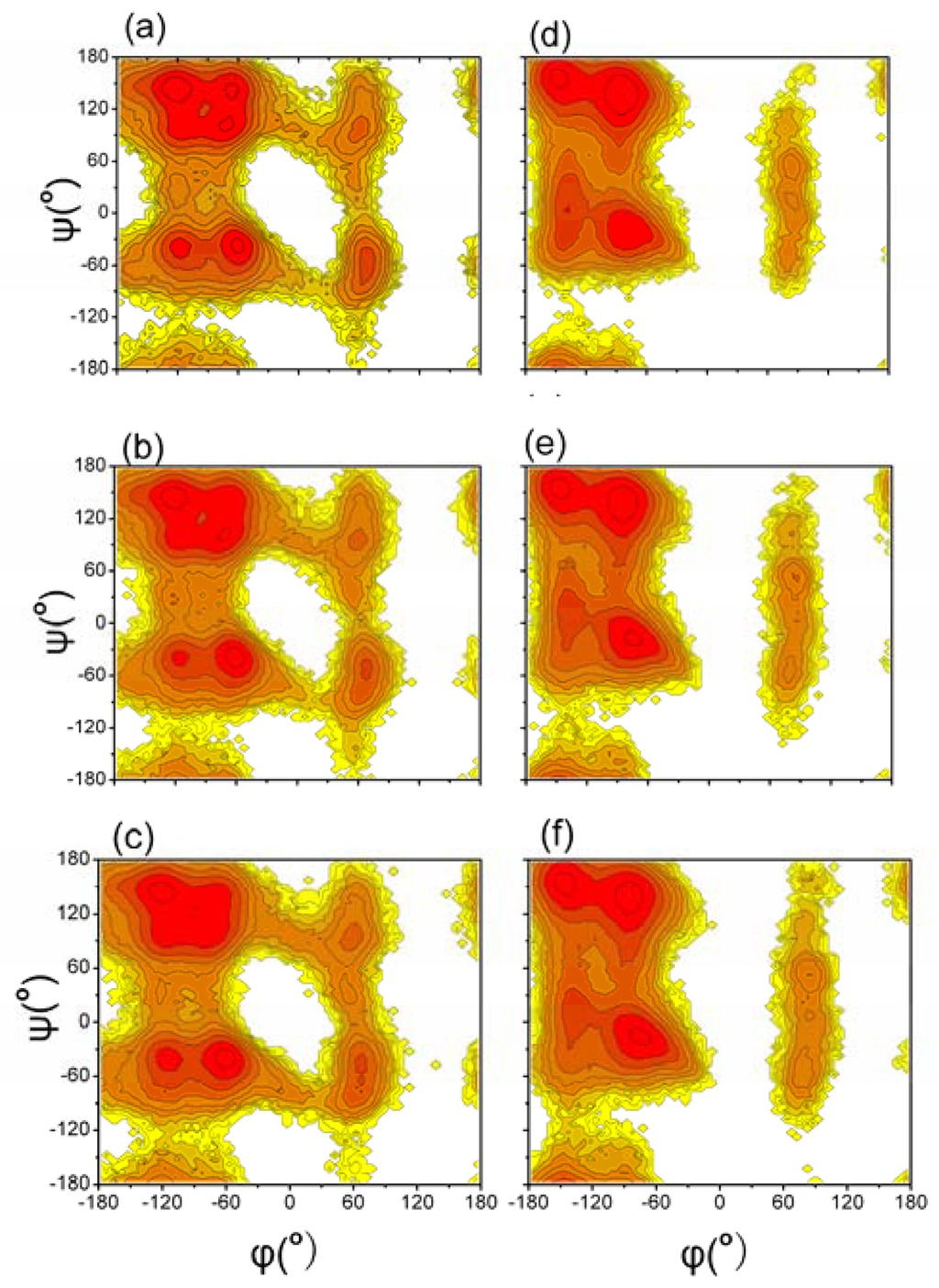 Potential of mean forces obtained from (ϕ, ψ) distributions of residues excluding glycine. Graph (a–c) plots the simulation using GROMOS 43A1/SPC model at 278 K, 298 K and 320 K respectively. Graph (d–f) plots the simulation using OPLS-AA/TIP4P model at 278 K, 298 K and 320 K respectively. Neighboring contour lines are separated by 2 kJ mol−1.