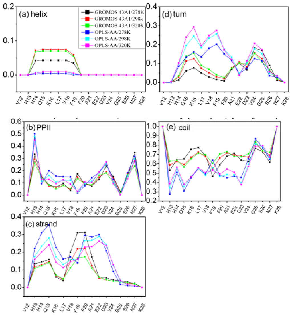 The total amounts of secondary structure propensity at different temperatures and force fields are summarized in Table 2. The total amounts of secondary structure propensity are calculated as the sum of all residues. The percentage of β-strand and PPII structure is seen to decrease with the increase of temperature. In particular, the β-strand centered around H13-K16 and F20-E22 lose about 5 percent as the temperature is raised from 278 K to 320 K for the simulation with OPLS-AA/TIP4P model (Figure 2c). While the percentage of β-turn and coil is seen to increase with the increase of temperature. The general trend for β-turn in most residues is to increase with temperature (Figure 2d).