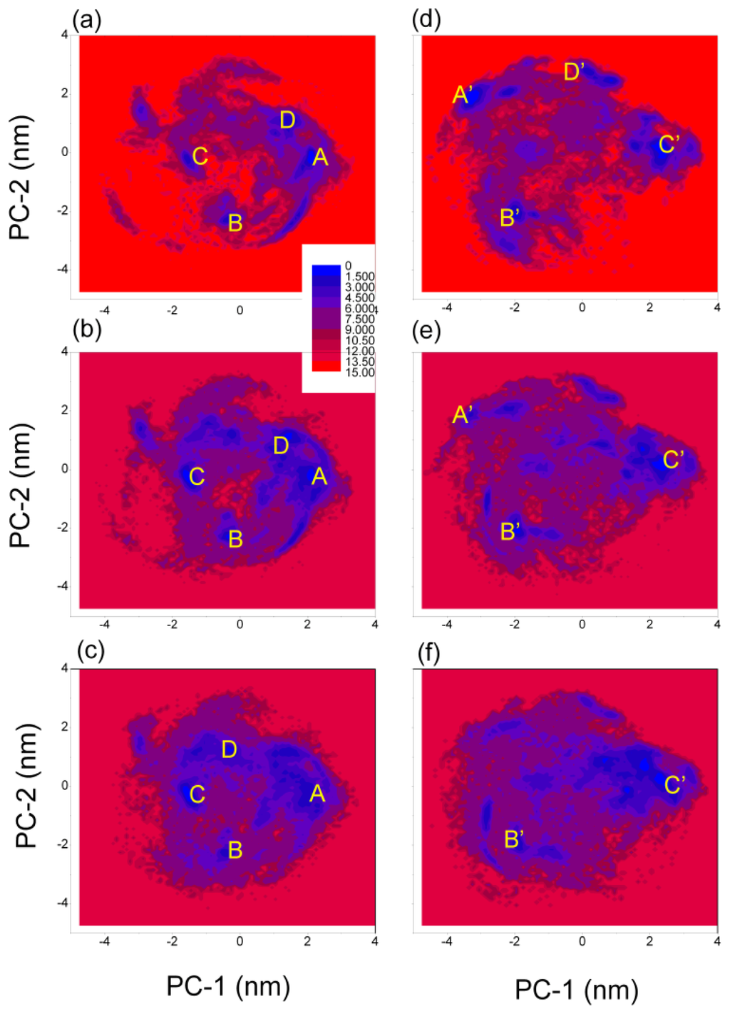 The corresponding representative structures are shown in Figure 3. We obtained the local minima in the four regions: (A′) located at (−3.25 nm, 1.95 nm) of (PC1, PC2), which corresponds to conformation ensemble with a β-turn at position V18-A21, with strands extending over residues H14-Q15 and S26-N27; (B′) located at (−1.95 nm, −2.15 nm), corresponding to a random coil ensemble; (C′) located at (2.35 nm, 0.25 nm), corresponding to conformation ensemble with a β-turn at position K16-V18, with strands extending over residues H13-Q15 and F19-A21; (D′) located at (0.25 nm, 2.75 nm), also corresponding to a random coil ensemble (shown in Figure 3).