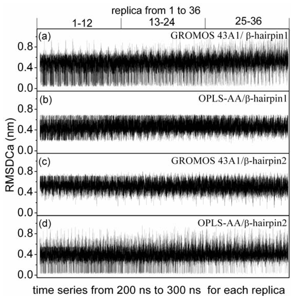 Positional root mean square deviations (RMSD) of alpha-carbon atoms with respect to the two different β-hairpin structures versus time series from 200 ns to 300 ns for each replica. Graphs (a) correspond to the simulation under GROMOS 43A1/SPC model with respect to the β-hairpin1 structure; Graphs (b) correspond to the simulation under OPLS-AA/TIP4P model with respect to the β-hairpin1 structure; Graphs (c) correspond to the simulation under GROMOS 43A1/SPC model with respect to the β-hairpin2 structure; Graphs (d) correspond to the simulation under OPLS-AA/TIP4P model with respect to the β-hairpin2 structure.