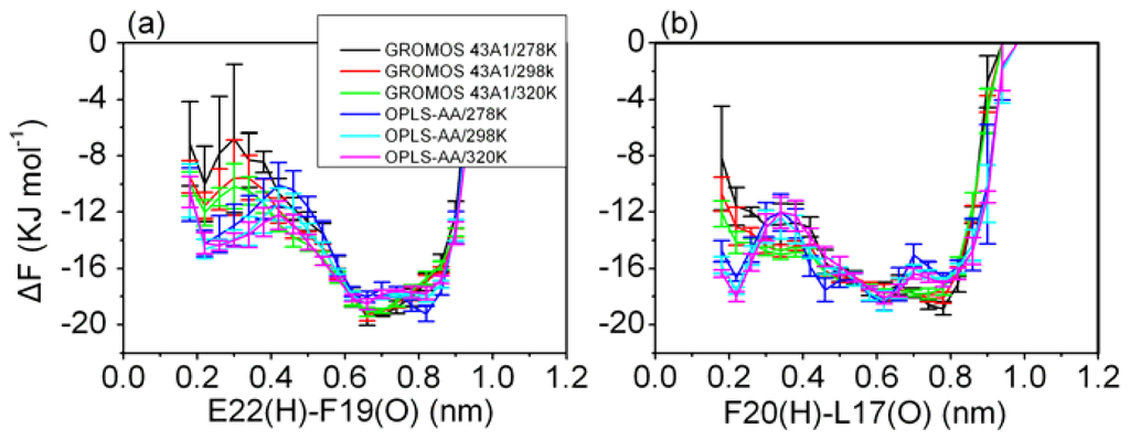 β-turn is an important factor involved in the folding of β-hairpin structure. To further describe the formation of β-turn in solution, the free energy profiles were calculated as a function of the distance between the hydrogen and oxygen atom involved in the β-turn hydrogen bonds. The relative free energy can be easily obtained by the following Equation: