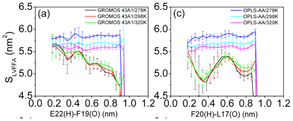 For the GROMOS 43A1/SPC model, the state has less distance between E22 (H) and F19 (O) is characterized by high solvent exposure of hydrophobic residues (SLVFFA plotted in Figure 6a) and high fraction of the SLVFFA to the total solvent accessible surface area (fLVFFA) (fLVFFA plotted in Figure 6b). These results are consistent with the other molecular dynamics simulation results [27]. However, high solvent exposure of hydrophobic residues is observed for all conformations sampled using the OPLS-AA force field (shown in Figure 6c,d). There is no obvious difference of exposure of the hydrophobic residues between the folded and the unfolded structure in the simulation using the OPLS-AA force field.