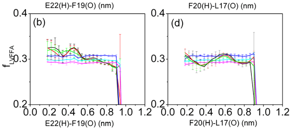 To further describe the structural character of Aβ (12–28) peptide in solution, the solvent accessible surface area of hydrophobic residues (LVFFA) as a function of the distance between E22 (H) and F19 (O) (or between F20 (H) and L17 (O)) were calculated (see in Figure 6). Error bars correspond to a standard deviation of the corresponding property were obtained by considering the four subsets of the simulation (the total 100 ns trajectory set has been evenly divided into the four 25 ns blocks for the simulation).