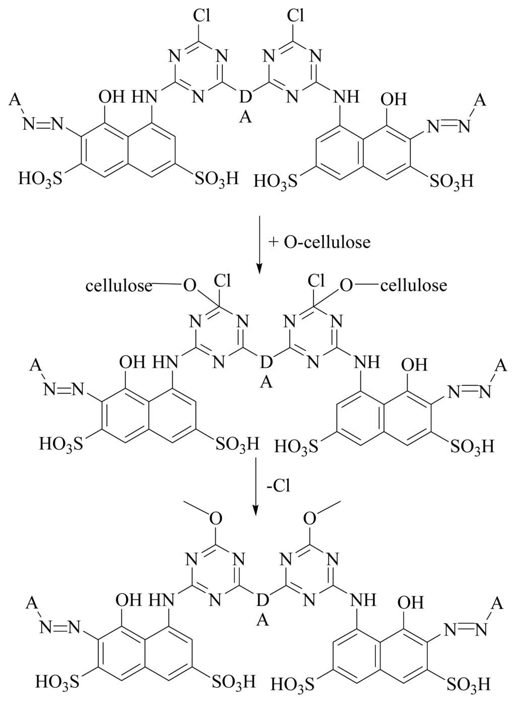 Mechanism of Reactive Dyes: Reactive dyes are nitrogen-containing heterocyclic rings bearing halogen substituents, therefore, undergo nucleophilic substitution reaction with the cellulose fiber. The heteroatom activates the system for nucleophilic attack due to its electro-negativity. The attacking nucleophile can be either a cellulose anion or a hydroxyl ion. This leads to fixation on the fabric after hydrolysis occurs of the reactive dye as shown in Figure 1. In addition, it is also important for a dye molecule to have a high dye-fabric covalent fixation value (F). This value is helpful to measure the dye affinity at the substrate or the amount of dye removed after the “soaping off process”. A high fixation value is helpful to reduce the time limit which is required for the dyeing process and also has an effect on the cost []. Besides, it is a measure of the extent of covalent bonding with the cellulose []. Dye fixation to cellulose fabric is triggered by acid-binding agents such as sodium hydroxide (NaOH), potassium hydroxide (KOH), sodium carbonate (Na2CO3), sodium bicarbonate (NaHCO3), potassium carbonate (K2CO3), sodium formate (HCOONa), sodiumdihydrogen phosphate (NaH2PO4) or disodium hydrogen phosphate (Na2HPO4). Higher fixation efficiency can be achieved by increasing reactive sites at the dye molecule by introducing two or more activating groups which react with the fabric. In this way, unfixed dye concentrations will reduce in the dye bath after dyeing and it becomes more economical and environmentally friendly.
