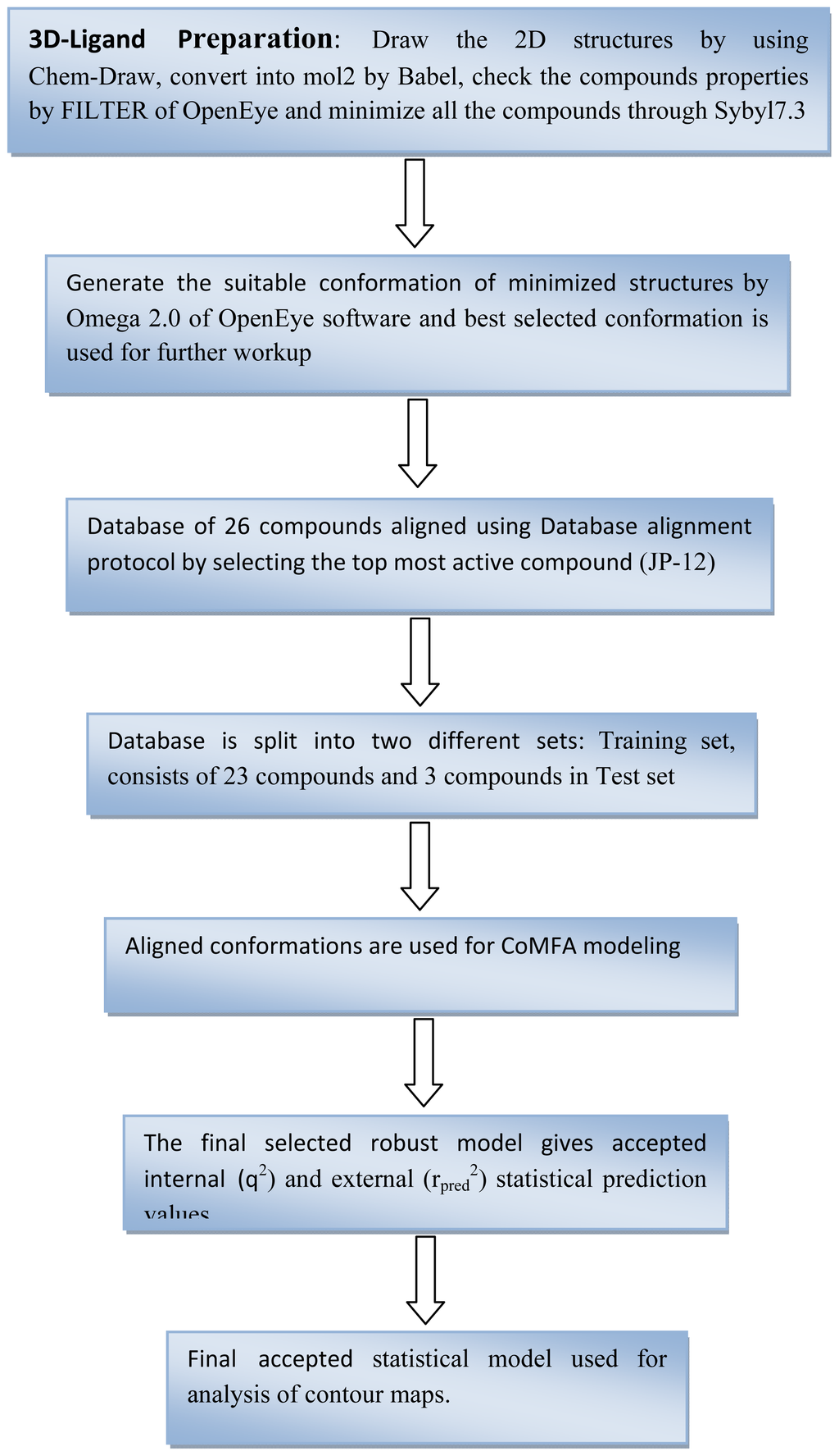 From the literature survey it is quite clear that 3D-QSPR predicted a reliable model which could help to design new reactive dyes according to the modification of the developed features. In the current study we reported the application of the CoMFA modeling on red reactive dyes. CoMFA has been applied to derive the relationship between the structural modification and absorbtivity which give the direct indication of the influence on the dimmer form of red reactive dyes binding on cellulose. The work flow strategy is represented in Figure 2.