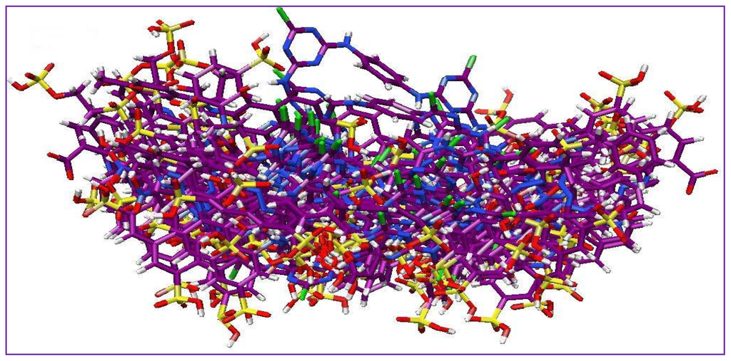 Alignment is one of the most significant steps for CoMFA studies. The 3D structures of the reactive dye molecules were aligned according to a suitable conformational template which showed higher interactive ability with the cellulose. In this case there are no previously reported data available for these reactive dyes which indicate the higher potency of structure within the dataset. Therefore, highest absorbtivity compound was considered as a template molecule. For the current work JP-12 was considered as a most reactive dye showed highest absorbtivity 6.32 dm3/mol/cm × 104 at 515.5 λmax.