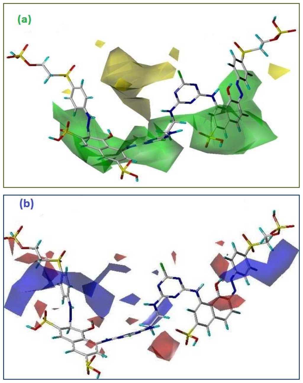 The CoMFA electrostatic contour plot is displayed in Figure 5(b) with a 50.3% field contribution; it holds an important position in the current predicted model by CoMFA. Blue contour indicates the region where the negative potential is unfavorable for the increment in absorbtivity of the dye structure, whereas the red areas have a negative potential that are favorable for the improvement of the affinity of the dyes with cellulose. Electropositive favored and disfavored charge cut-off energies were also pinched at 90% and 10% of the dye structure.