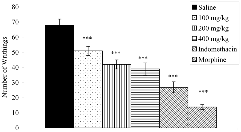 The acetic-acid writhing test is used for the evaluation of analgesic activity [26]. Mice (n = 8 per group) were injected (i.p.) with 0.6% acetic acid (10 mL/kg body weight), and the intensity of nociception was quantified by counting the total number of writhes that occurred between 10 and 30 min after injection. Animals received ethanol extract (100, 200 or 400 mg/kg, p.o.) or sterile saline (control group, 0.9%, w/v) 60 min before acetic acid injection. Indomethacin (10 mg/kg, p.o.) and morphine (1 mg/kg, s.c.) were administered 60 min before acetic acid as reference compounds.
