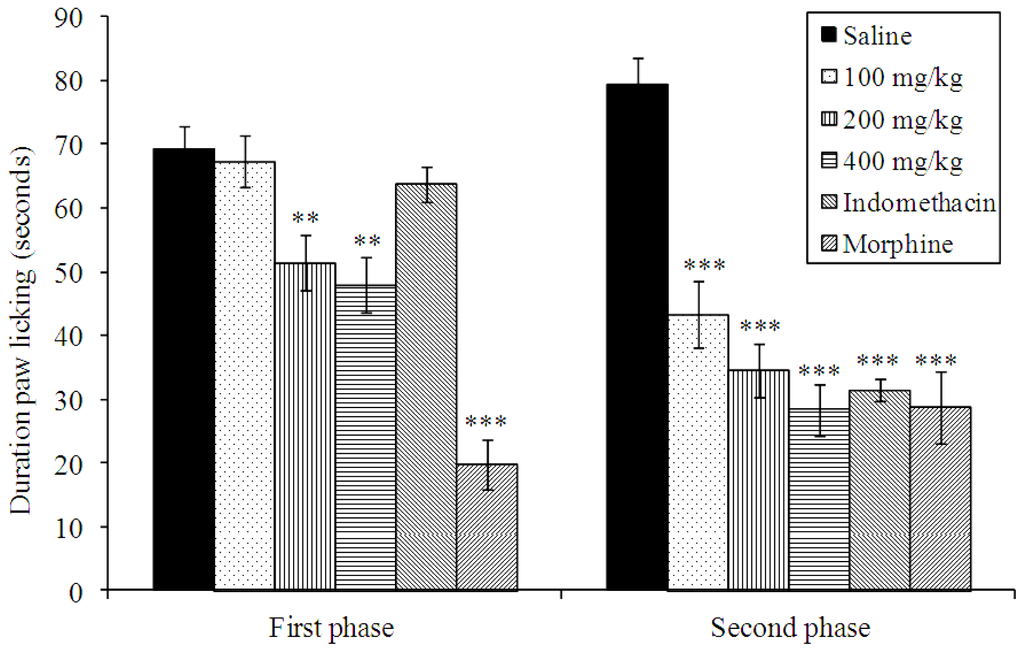 The intraplantar injection of formalin promoted a biphasic characteristic response (Figure 2). The time spent licking in the first phase (0–5 min) was 66.62 ± 4.76 s and in the second phase (15–30 min) was 79.37 ± 4.15 s for the control group. After 60 min of treatment, a significant reduction in the licking time (p < 0.01) was observed during the first phase after formalin administration (neurogenic) by 25.14 and 31.15% with 200 and 400 mg/kg of extract, respectively (Figure 2). In the second phase, the doses of 100, 200 and 400 mg/kg of extract inhibited significantly (p < 0.001) at 45.36, 56.38 and 64.26%, respectively, when compared to the control. As expected, morphine (1 mg/kg, s.c.) significantly reduced the formalin response in both phases. The indomethacin inhibitory effect was observed in the second phase.