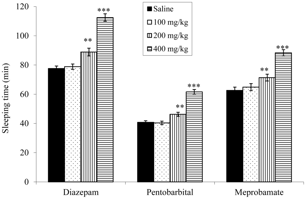 Mice were divided into 4 groups, each group containing 8 animals. The animals of group I served as the control (normal saline, 0.9 % (w/v) NaCl, 5 mL/kg); groups II, III, and IV received ethanol extract at the doses (100 mg/kg, 200 mg/kg and 400 mg/kg, respectively). Normal saline and the extracts were applied orally 60 min prior to the administration of pentobarbital sodium (40 mg/kg, i.p.), diazepam (3 mg/kg, i.p.) and meprobamate (100 mg/kg, i.p.). The sleeping time was noted by recording the interval between the losses and regaining of righting reflex [51].
