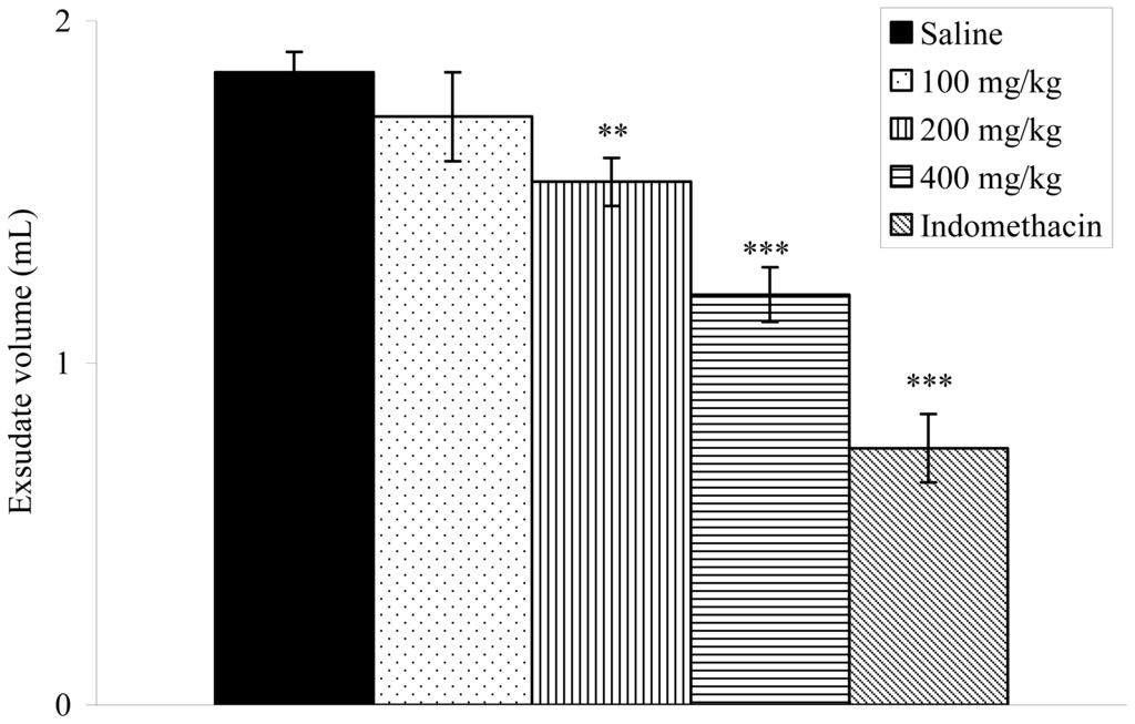 Effects of the ethanol extract from V. condensata leaves on pleural exudation in carrageenan-induced pleurisy in rats. Data are mean ± S.E.M. of six rats. ** P < 0.01, *** P < 0.001 vs. control group.