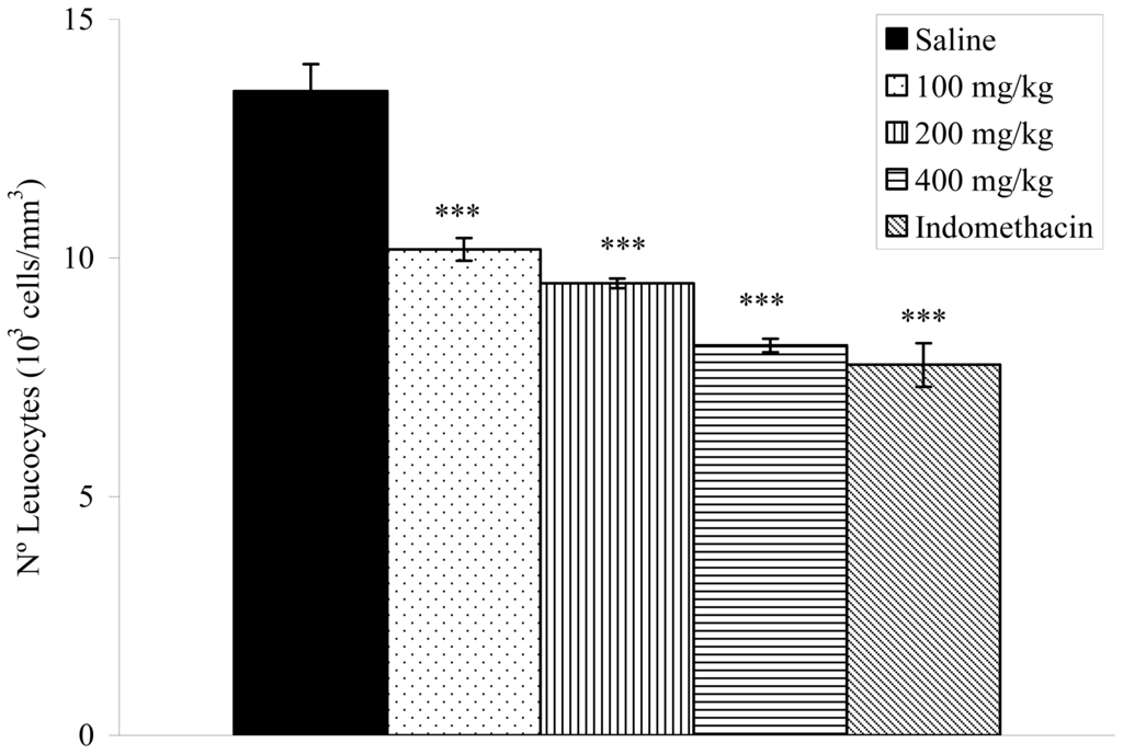 The anti-inflammatory effect of the V. condensata ethanol extract was confirmed by a decrease in exudate volume and leukocyte migration to the pleural cavity of rats. The pleurisy effects demonstrated that doses of 200 (1.53 ± 0.07; p < 0.01) and 400 mg/kg (1.20 ± 0.08; p < 0.001) of the extract significantly reduced the exudate volume by 17.30 and 35.13%, respectively, when compared to the control group (Figure 4). The number of total leukocytes was inhibited significantly (p < 0.001) at the doses of 100 (10.18 ± 0.24 × 103 cells/mm3), 200 (9.47 ± 0.10 × 103 cells/mm3) and 400 mg/kg (8.17 ± 0.14 × 103 cells/mm3) (Figure 5). Indomethacin reduced the exudate volume and the leukocyte migration.