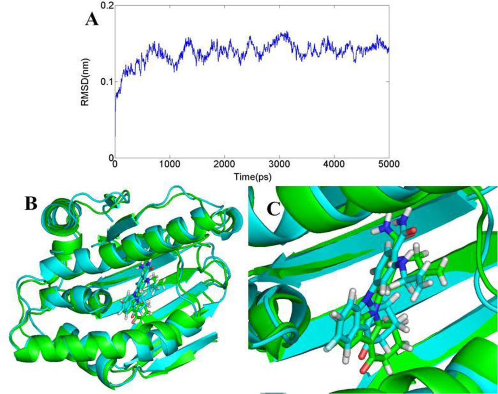 (A) Plot of the root-mean-square deviation (RMSD) of docked complex versus the MD simulation time in the MD-simulated structures; (B), (C) View of superimposed backbone atoms of the lowest energy structure of the MD simulation (cyan) and the initial structure (green) for compound 24-2XJG complex. Compound 24 is represented as carbon-chain in green for the initial complex and carbon-chain in cyan for the lowest energy complex.