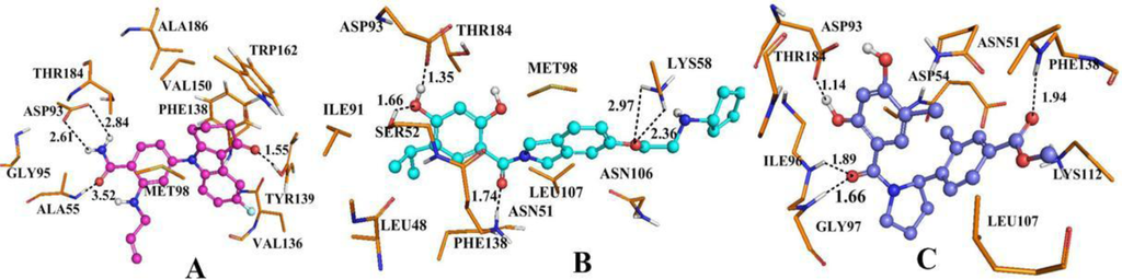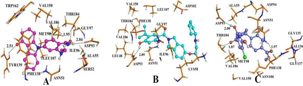 Figure 9C shows the result of the docking study with compound 19 as a template. Compound 19 forms a hydrogen bond between the oxygen atom of the −COO group at 4′ position of ring C and hydrogen atom of −NH group of Asn51 (−O···HN, 1.97 Å, 142.4°). At the same time, the carbonyl oxygen atom at the linker, between ring A and ring B, forms hydrogen bond with the hydrogen atom of −OH group of Thr184 (−O···HO, 1.87 Å, 154°). In addition, the third hydrogen bond forms between hydrogen atom of −OH group which is at C2 position of ring A and the oxygen atom of the −COO group of Asp93 (−O···HO, 2.00 Å, 114.4°). This is consistent with the H-bond donor contour map (Figure 8D). The cyan contour around the C2 position of ring A suggests this is a H-bond donor favorable region. All of the hydrogen bonds described above are the same as those described in the original paper [34]. Figure 9C displays the methyl substituent at C2′ position of ring C embedded into a relatively large pocket composed of Val136, Gly135, Asn106. From the docking results, we can see that there is large free space in this pocket, suggesting that there is sufficient room for introducing bulky substituents, which is also validated by a sterically favorable green contour at this position seen in the CoMSIA model. The hydrophilic favorable white contour at the C2′ position of ring C is enclosed by Asn106, Asn51 and Gly137, which explains the increased activity after introducing hydrophilic groups in this area. The C2′ position of ring C is surrounded by carbonyl group of Asp54 and Ser50 suggesting that electropositive substituents in this area are favorable for a binding activity of a ligand, correlating well with the analysis of the electrostatic contour map of the CoMSIA model which has a blue contour at this position. The red contour (Figure 8B) at the C4′ position of ring C suggests an electronegative favorable region, corroborated by introducing suitable electronegative groups which would have a favorable interaction with the backbone NH of Phe138 and Asn51.