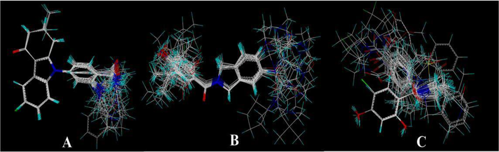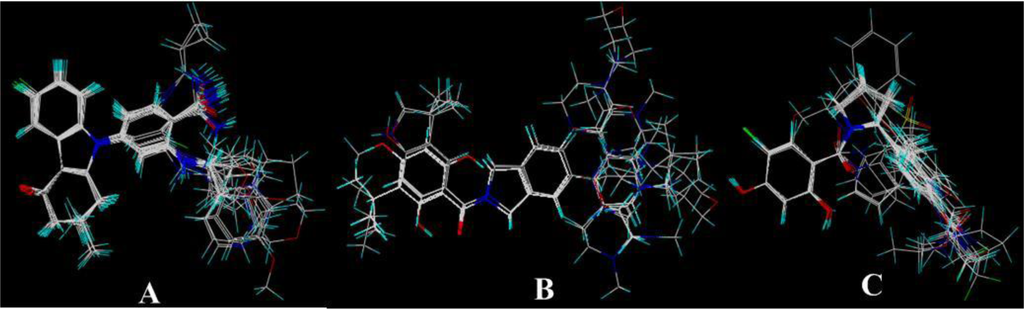 Receptor-based alignment. (A) Compound 17 was selected as a template for alignment; (B) Compound 24 was used as a template for alignment; (C) Compound 19 was employed as a template for alignment. Alignment of these compounds was further used for 3D-QSAR model generation.