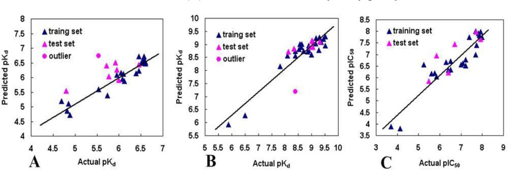 Plot of the predicted pIC50 versus the experimental pIC50 values for the models. (A) COMFA model of benzamide tetrahydro-4H-carbazol-4-one analogs; (B) CoMSIA model of AT13387 Derivatives; (C) CoMSIA model of dihydroxylphenyl amides.