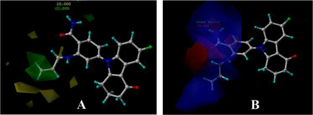 CoMFA StDev*Coeff contour plots for benzamide tetrahydro-4H-carbazol-4-one analogs in combination with compound 17. (A) The green (sterically favorable) and yellow (sterically unfavorable) contours represent 80% and 20% level contributions, respectively; (B) The blue (electropositive charge favorable) and red (electronegative charge favorable) contours represent 70% and 30% level contributions, respectively.