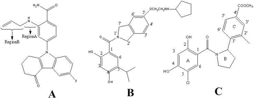 The most active molecule showing different regions which are used in contour analysis. (A) Compound 17 in the group of benzamide tetrahydro-4H-carbazol-4-one analogs; (B) Compound 24 in the class of AT13387 Derivatives; (C) Compound 19 in the series of dihydroxylphenyl amides.