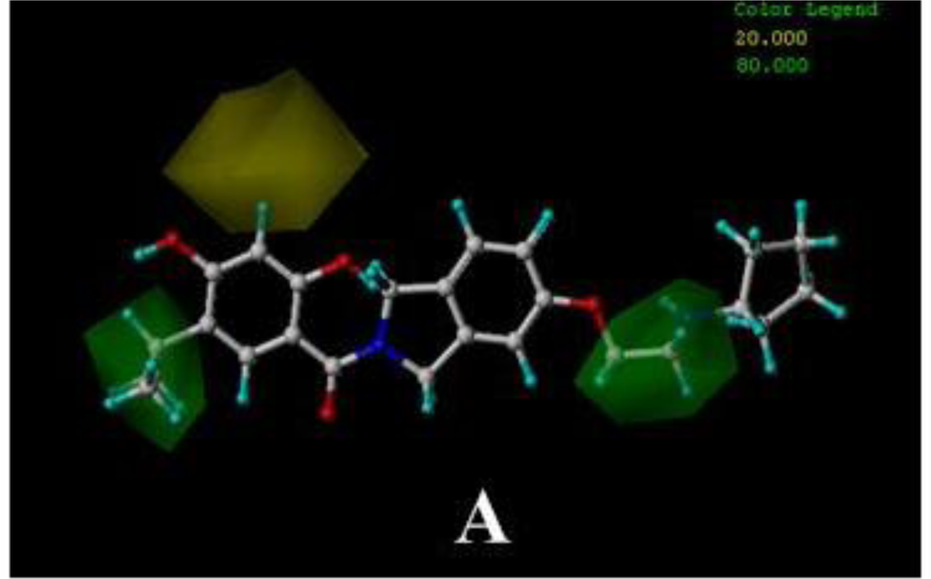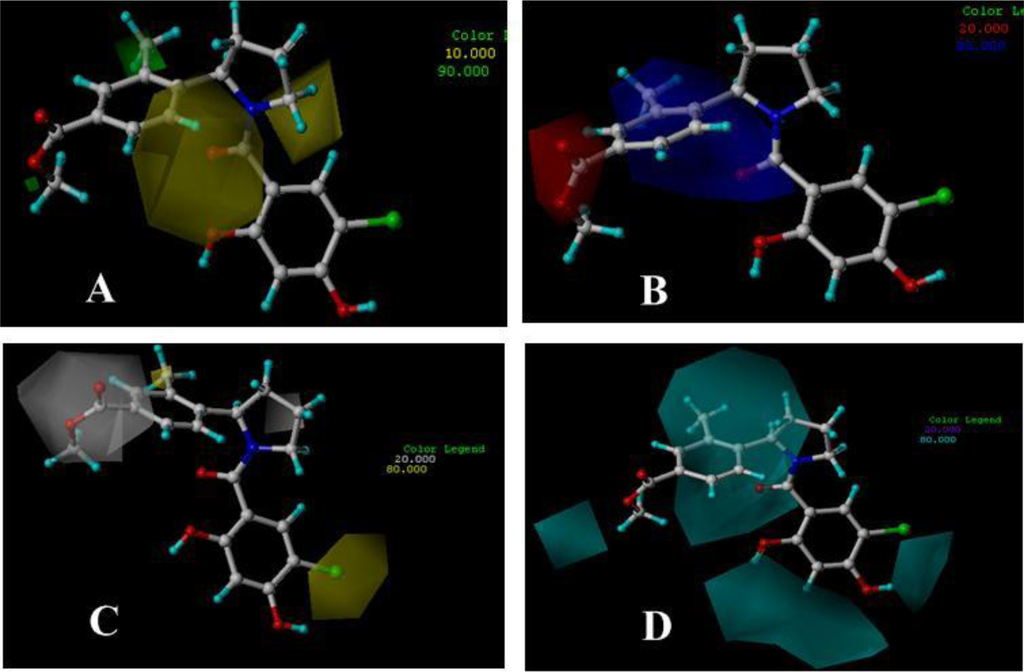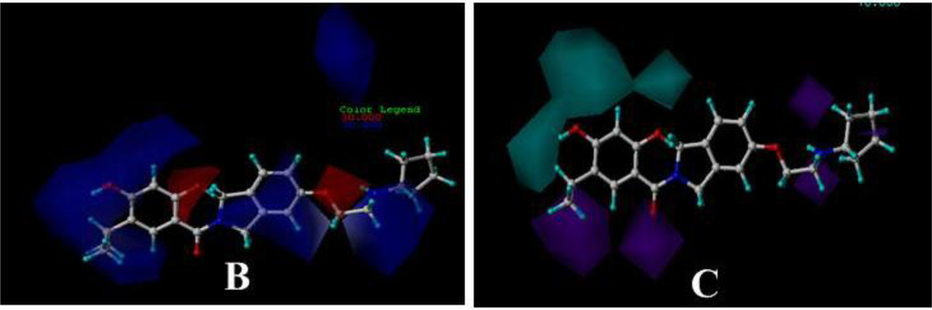 CoMFA, and CoMSIA contour maps were generated to visualize the information of the derived 3D-QSAR model by plotting the coefficients from CoMFA and CoMSIA QSAR models, which represent the lattice points and the difference in the field values at lattice point. Briefly, the contour maps indicate regions in 3D space around the molecules where changes in the particular physicochemical properties are predicted to increase or decrease potency. To aid in visualization, the most active compounds are shown with the contour maps.