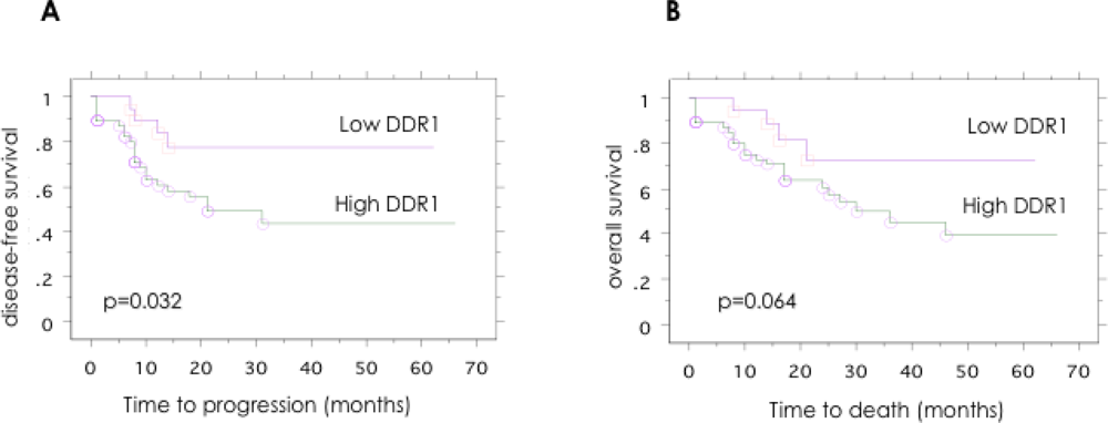 2.4. Association between the Expression of DDR1 Protein in Ovarian Cancer and the Clinical Disease Stage, Tumor Grade, and Patient Outcome