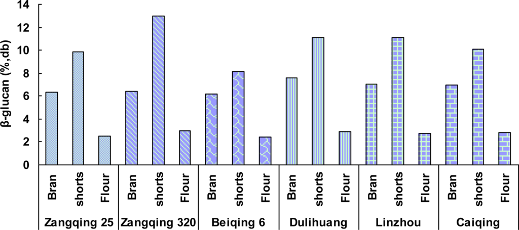 Hull-less barley can be easily separated into flour and bran fractions using conventional wheat-milling equipment []. Although barley has not traditionally been roller-milled like wheat to obtain flour and bran, this may change in the near future because of barley’s high soluble fiber content and its potential use in many food products. The objective of this study is to obtain detailed information on the distribution and molecular properties of β-glucans among six hull-less barley cultivars and their roller-milled fractions. The information obtained will provide indications of the nutritional quality and potential uses of the milled products.