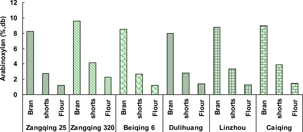 The distribution of arabinoxylan in hull-less barley kernel was also uneven. Bran contained the highest concentration of arabinoxylan (7.99–9.59%), followed by shorts (2.29–3.86%) and flour (1.2–2.29%). The results indicate arabinoxyaln mainly existed in the outer bran part, then the aleurone part, and the endosperm had the lowest arabinoxyaln concentration.