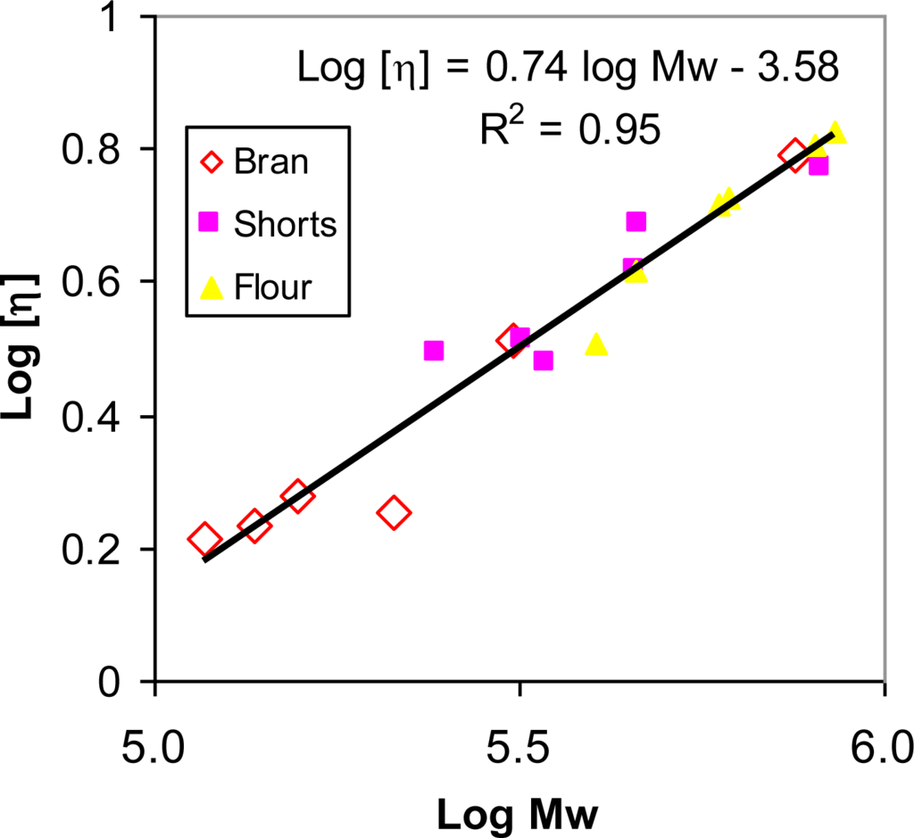 The intrinsic viscosities of purified β-glucans from all the fractions ranged between 1.6 and 6.8 dL/g. The relationship between molecular weight and intrinsic viscosity followed a common Mark-Houwink plot (Figure 3), with an exponent of 0.74, irrespective of the source of β-glucans. This indicates that there is no significant conformational difference between β-glucans from bran, shorts and flour.