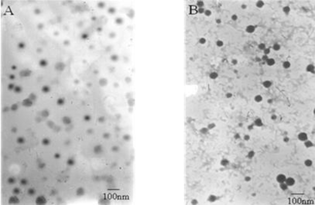 Transmission electron micrograms of DTX-micelles. (A) fresh-prepared micelles (×72,000); (B) freeze-dried micelles (×72,000).