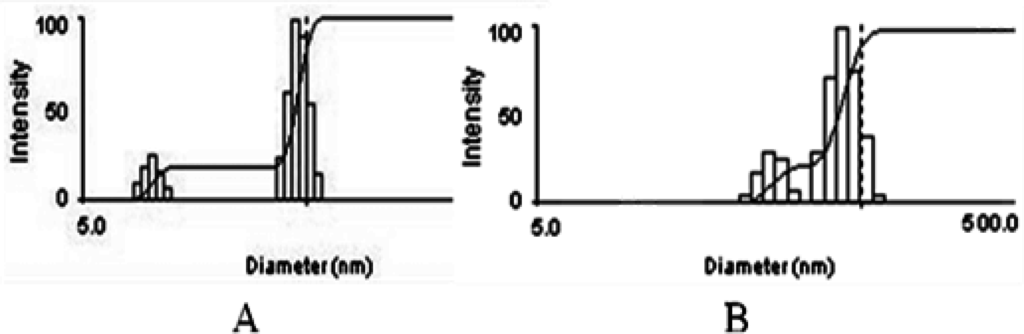 Size distribution of DTX-micelles determined by DLS. (A) fresh-prepared micelles; (B) freeze-dried micelles.