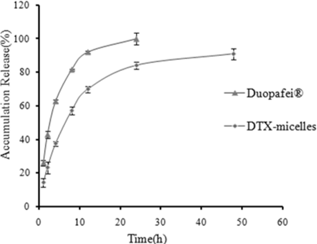 Accumulative DTX release from Duopafei® and DTX-micelles in PBS (phosphate buffer solution, pH 7.4) containing 0.5% Tween 80 at 37 ± 0.5 °C (n = 3).