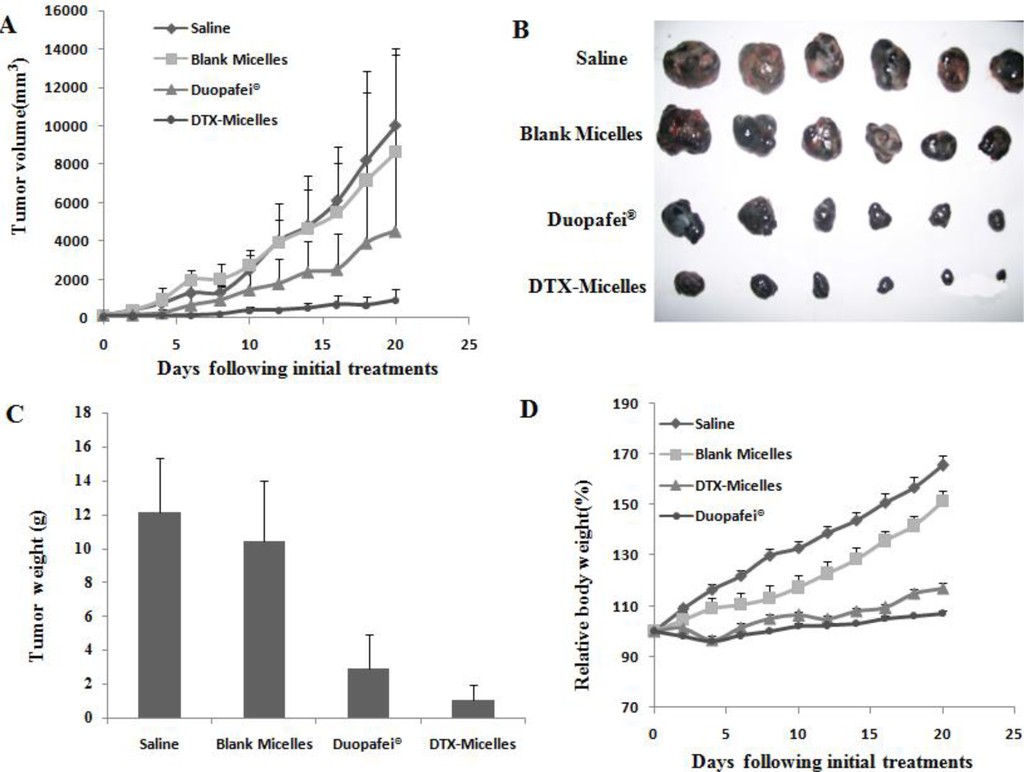 The in vivo antitumor effect of DTX-micelles. (A) the changes of tumor volumes of the tested groups; (B) the typical photographs of excised sarcomas from the tested groups; (C) the weights of excised tumor mass; (D) the variation of relative body weight of the mice with time. * P < 0.05, ** P < 0.01 versus Duopafei®.