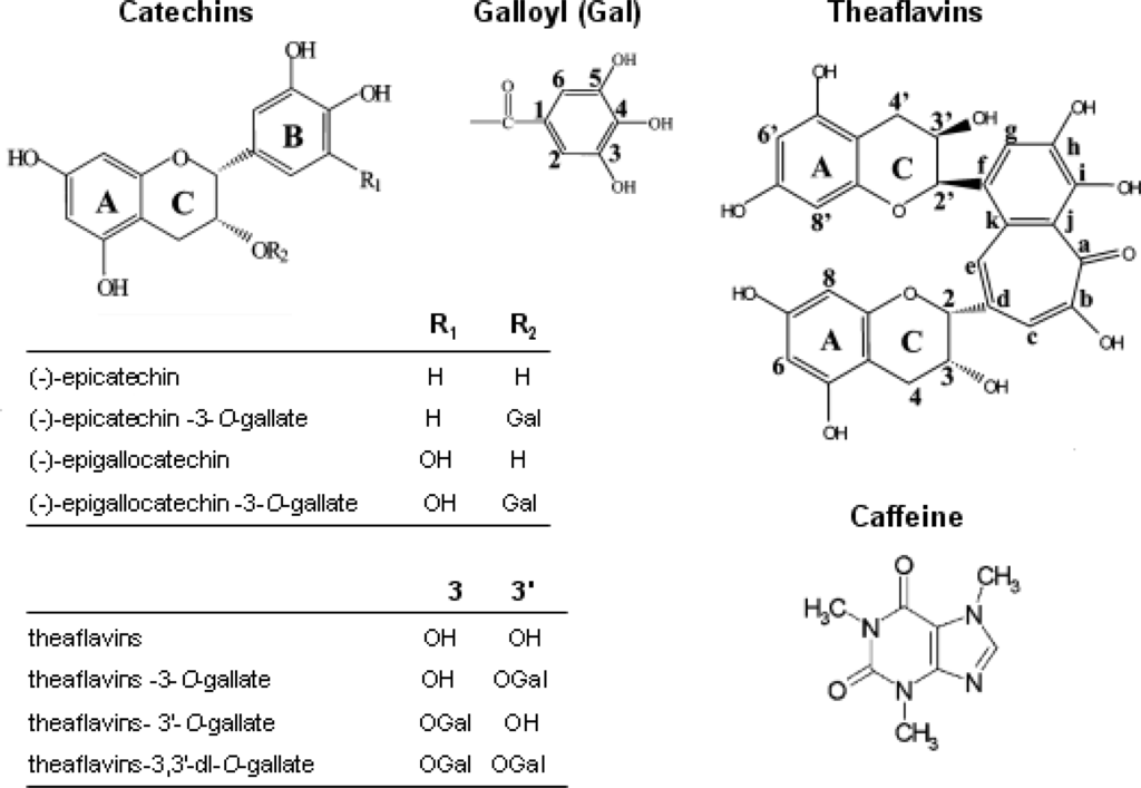 Catechins, which comprise epigallocatechin-3-gallate (EGCG), epigallocatechin (EGC), epicatechin-3-gallate (ECG), and epicatechin (EC), are members of the four main tea phenolic compounds. Catechins have attracted significant attention recently [10]. The manufacturing process is designed to either prevent or allow tea polyphenols to be oxidized by naturally occurring polyphenol oxidase enzymes in the leaves. The production of green tea is to avoid the oxidation of polyphenols. In contrast, black tea and pu-erh tea are produced by promoting enzymatic oxidation of tea polyphenols. During the fermentation process, catechins are oxidized to complex compounds. Theaflavins, thearubigins and theabrownins are the main pigments and complex phenolic compounds deriving from the oxidation of catechins and their gallates during this processing. Theaflavins undergo further oxidation during fermentation to form more polymerized thearubigins, and then condensed theabrownins [11–13]. Caffeine exists widely in the leaves, seeds and fruits of a large number of plants. It is obtained by extraction from tea or coffee, fermentation of dry tea enhances or reduces its caffeine content mainly due to the molds. The change of caffeine with fermentation time is similar in the fermentation process [14,15]. The chemical structures of some compounds are illustrated in Figure 1.