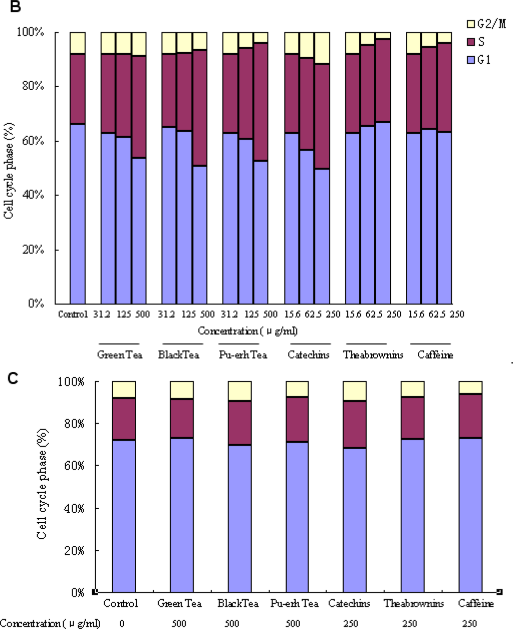 The tea extract and tea main compounds-mediated inhibition of cell proliferation was then examined by investigating the effects on cell-cycle distribution after treatment with three concentrations (Figure 4B). Cell populations in the G1, S and G2/M phases were 66.19%, 25.81% and 8.00%, respectively, in control SGC-7901 cells. After 48 h of incubation with 500 μg/mL green, black and pu-erh tea extract, the population of S phase cells increased to 37.49%, 42.83% and 43.67%, the population of G2/M phase cells in the green tea groups was almost identical to that in the population of control cells, while the populations were significantly decreased to 6.59% and 3.59% in black and pu-erh tea groups (Figure 4A). The result indicated that the fermentation process may be involved in the changes.