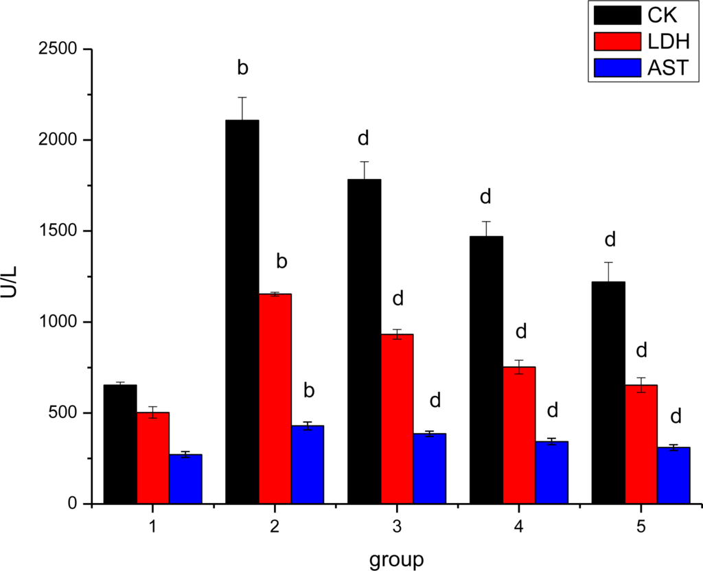 Effect of Ligusticum wallichii extract on serum CK, LDH and AST activities. b P < 0.01 compared with SO control group; d P < 0.01 compared with IR model group. Group 1: sham operation (SO); group 2: ischemia reperfusion (IR); group 3: Ligusticum wallichii extract (LWE) 0.2 g/kg body weight; group 4: LWE 0.4 g/kg body weight; group 5: LWE 0.6 g/kg body weight.