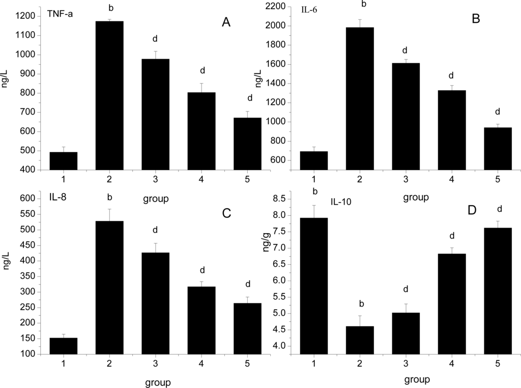 Effect of Ligusticum wallichii extract on serum TNF-α (A), IL-6 (B), IL-8 (C) and myocardium IL-10 (D) levels. b P < 0.01 compared with SO control group; d P < 0.01 compared with IR model group. Group 1: sham operation (SO); group 2: ischemia reperfusion (IR); group 3: Ligusticum wallichii extract (LWE) 0.2 g/kg body weight; group 4: LWE 0.4 g/kg body weight; group 5: LWE 0.6 g/kg body weight.