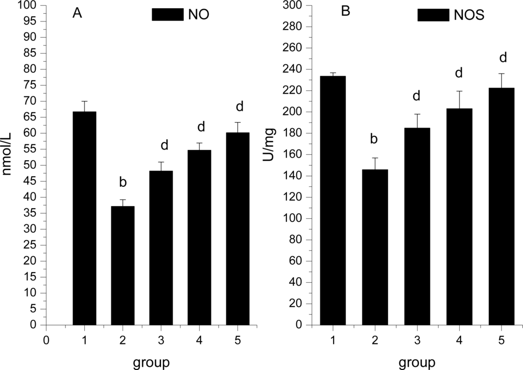 Effect of Ligusticum wallichii extract on serum NO level and myocardium NOS activity. b P < 0.01 compared with SO control group; d P < 0.01 compared with IR model group. Group 1: sham operation (SO); group 2: ischemia reperfusion (IR); group 3: Ligusticum wallichii extract (LWE) 0.2 g/kg body weight; group 4: LWE 0.4 g/kg body weight; group 5: LWE 0.6 g/kg body weight.