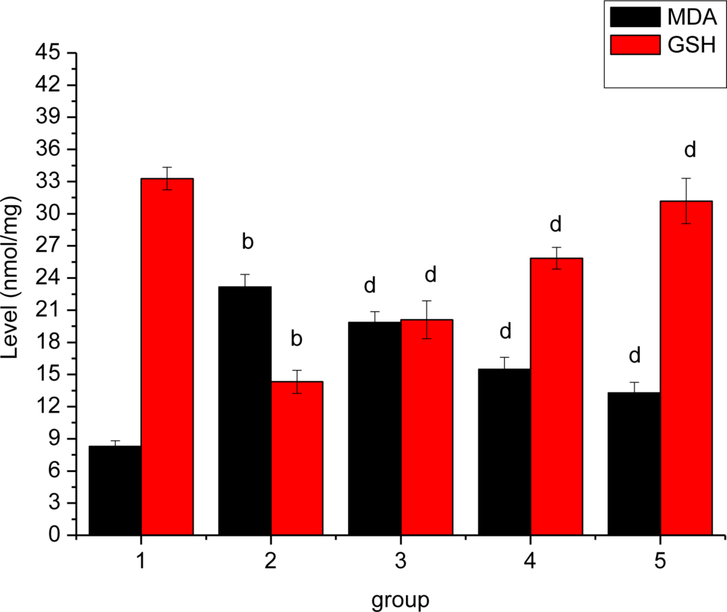 Effect of Ligusticum wallichii extract on myocardium MDA and GSH levels. b P < 0.01 compared with SO control group; d P < 0.01 compared with IR model group. Group 1: sham operation (SO); group 2: ischemia reperfusion (IR); group 3: Ligusticum wallichii extract (LWE) 0.2 g/kg body weight; group 4: LWE 0.4 g/kg body weight; group 5: LWE 0.6 g/kg body weight.